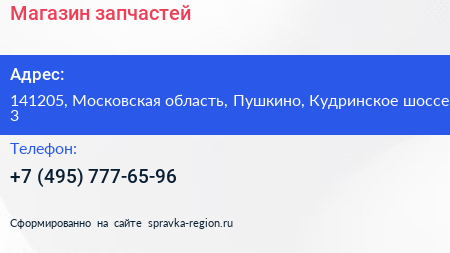 Магазин запчастей по адресу 141205, Московская область, Пушкино, Кудринское шоссе, 3 в дальнейшем Организация, размещена в следующих категориях: