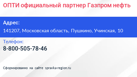 ОПТИ, официальный партнер Газпром нефть по адресу 141207, Московская область, Пушкино, Учинская, 10 в дальнейшем Организация, размещена в следующих категориях: