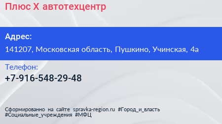 Плюс-Х, автотехцентр по адресу 141207, Московская область, Пушкино, Учинская, 4а в дальнейшем Организация, размещена в следующих категориях: