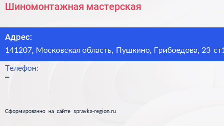 Шиномонтажная мастерская по адресу 141207, Московская область, Пушкино, Грибоедова, 23 ст1 в дальнейшем Организация, размещена в следующих категориях: