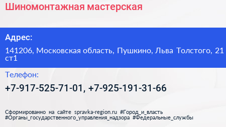 Шиномонтажная мастерская по адресу 141206, Московская область, Пушкино, Льва Толстого, 21 ст1 в дальнейшем Организация, размещена в следующих категориях:
