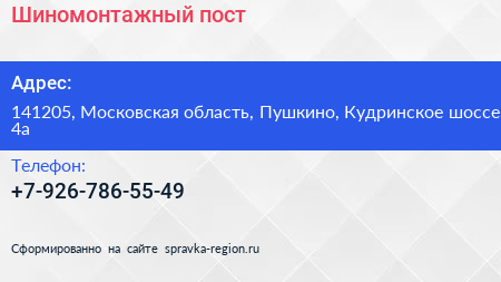 Шиномонтажный пост по адресу 141205, Московская область, Пушкино, Кудринское шоссе, 4а в дальнейшем Организация, размещена в следующих категориях:
