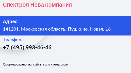 Спектрол-Нева, компания по адресу 141201, Московская область, Пушкино, Новая, 16 в дальнейшем Организация, размещена в следующих категориях: