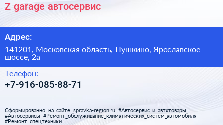 Z-garage, автосервис по адресу 141201, Московская область, Пушкино, Ярославское шоссе, 2а в дальнейшем Организация, размещена в следующих категориях:
