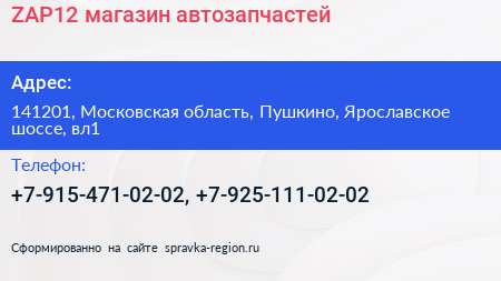 ZAP12, магазин автозапчастей по адресу 141201, Московская область, Пушкино, Ярославское шоссе, вл1 в дальнейшем Организация, размещена в следующих категориях: