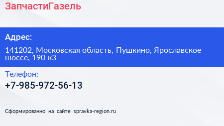 ЗапчастиГазель по адресу 141202, Московская область, Пушкино, Ярославское шоссе, 190 к3 в дальнейшем Организация, размещена в следующих категориях: