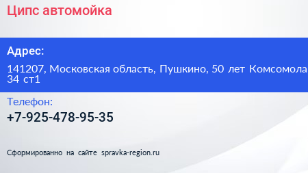 Ципс, автомойка по адресу 141207, Московская область, Пушкино, 50 лет Комсомола, 34 ст1 в дальнейшем Организация, размещена в следующих категориях: