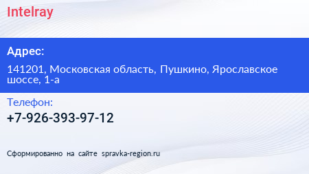 Intelray по адресу 141201, Московская область, Пушкино, Ярославское шоссе, 1-а в дальнейшем Организация, размещена в следующих категориях: