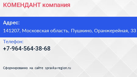 КОМЕНДАНТ, компания по адресу 141207, Московская область, Пушкино, Оранжерейная, 33 в дальнейшем Организация, размещена в следующих категориях: