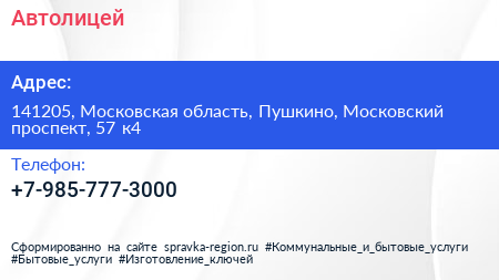 Автолицей по адресу 141205, Московская область, Пушкино, Московский проспект, 57 к4 в дальнейшем Организация, размещена в следующих категориях: