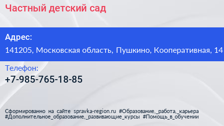 Частный детский сад по адресу 141205, Московская область, Пушкино, Кооперативная, 14 в дальнейшем Организация, размещена в следующих категориях: