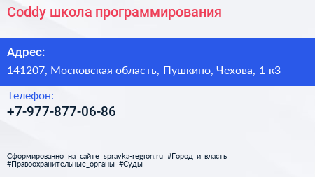 Coddy, школа программирования по адресу 141207, Московская область, Пушкино, Чехова, 1 к3 в дальнейшем Организация, размещена в следующих категориях:
