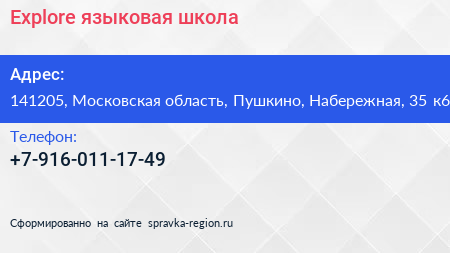 Explore!, языковая школа по адресу 141205, Московская область, Пушкино, Набережная, 35 к6 в дальнейшем Организация, размещена в следующих категориях: