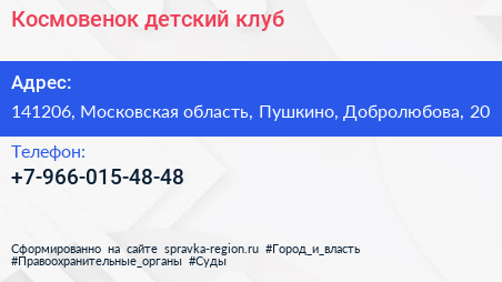 Космовенок, детский клуб по адресу 141206, Московская область, Пушкино, Добролюбова, 20 в дальнейшем Организация, размещена в следующих категориях:
