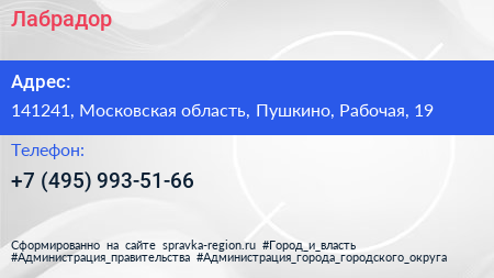 Лабрадор по адресу 141241, Московская область, Пушкино, Рабочая, 19 в дальнейшем Организация, размещена в следующих категориях: