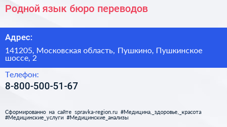 Родной язык, бюро переводов по адресу 141205, Московская область, Пушкино, Пушкинское шоссе, 2 в дальнейшем Организация, размещена в следующих категориях: