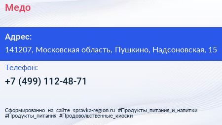 Медо по адресу 141207, Московская область, Пушкино, Надсоновская, 15 в дальнейшем Организация, размещена в следующих категориях: