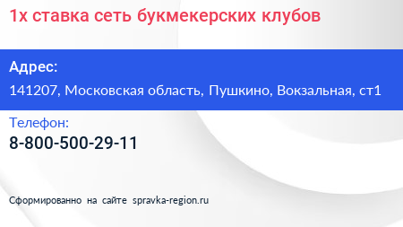 1x ставка, сеть букмекерских клубов по адресу 141207, Московская область, Пушкино, Вокзальная, ст1 в дальнейшем Организация, размещена в следующих категориях: