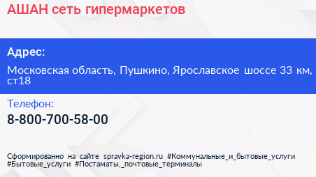 АШАН, сеть гипермаркетов по адресу Московская область, Пушкино, Ярославское шоссе 33 км, ст18 в дальнейшем Организация, размещена в следующих категориях: