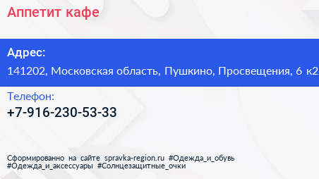 Аппетит, кафе по адресу 141202, Московская область, Пушкино, Просвещения, 6 к2 в дальнейшем Организация, размещена в следующих категориях: