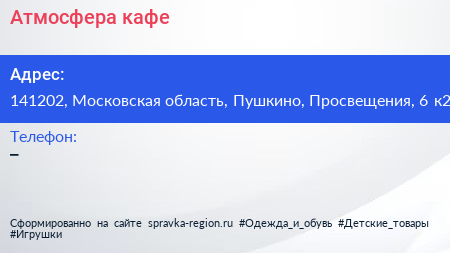 Атмосфера, кафе по адресу 141202, Московская область, Пушкино, Просвещения, 6 к2 в дальнейшем Организация, размещена в следующих категориях: