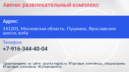 Авеню, развлекательный комплекс по адресу 141201, Московская область, Пушкино, Ярославское шоссе, вл4а в дальнейшем Организация, размещена в следующих категориях: