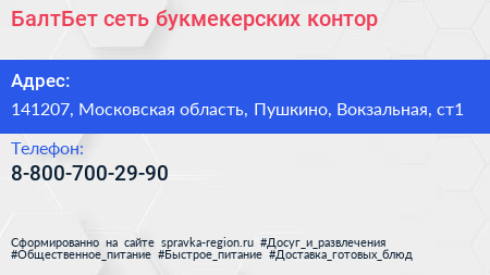 БалтБет, сеть букмекерских контор по адресу 141207, Московская область, Пушкино, Вокзальная, ст1 в дальнейшем Организация, размещена в следующих категориях: