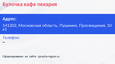 Булочка, кафе-пекарня по адресу 141202, Московская область, Пушкино, Просвещения, 10 к1 в дальнейшем Организация, размещена в следующих категориях: