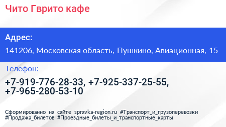 Чито Гврито, кафе по адресу 141206, Московская область, Пушкино, Авиационная, 15 в дальнейшем Организация, размещена в следующих категориях: