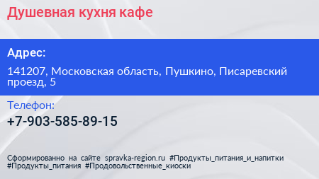 Душевная кухня, кафе по адресу 141207, Московская область, Пушкино, Писаревский проезд, 5 в дальнейшем Организация, размещена в следующих категориях: