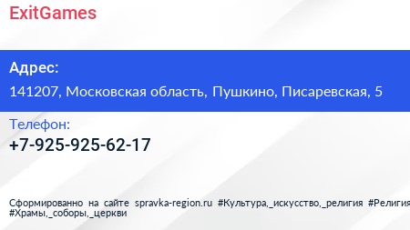 ExitGames по адресу 141207, Московская область, Пушкино, Писаревская, 5 в дальнейшем Организация, размещена в следующих категориях: