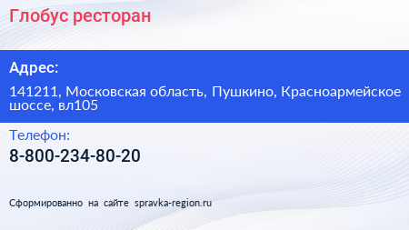 Глобус, ресторан по адресу 141211, Московская область, Пушкино, Красноармейское шоссе, вл105 в дальнейшем Организация, размещена в следующих категориях: