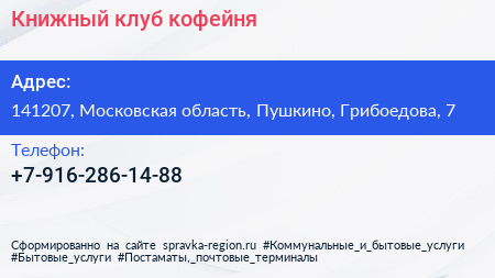 Книжный клуб, кофейня по адресу 141207, Московская область, Пушкино, Грибоедова, 7 в дальнейшем Организация, размещена в следующих категориях: