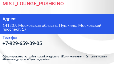 MIST_LOUNGE_PUSHKINO по адресу 141207, Московская область, Пушкино, Московский проспект, 17 в дальнейшем Организация, размещена в следующих категориях: