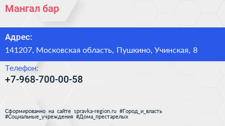 Мангал, бар по адресу 141207, Московская область, Пушкино, Учинская, 8 в дальнейшем Организация, размещена в следующих категориях: