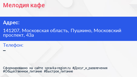 Мелодия, кафе по адресу 141207, Московская область, Пушкино, Московский проспект, 43а в дальнейшем Организация, размещена в следующих категориях: