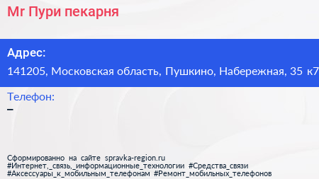 Mr.Пури, пекарня по адресу 141205, Московская область, Пушкино, Набережная, 35 к7 в дальнейшем Организация, размещена в следующих категориях: