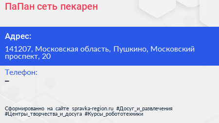 ПаПан, сеть пекарен по адресу 141207, Московская область, Пушкино, Московский проспект, 20 в дальнейшем Организация, размещена в следующих категориях: