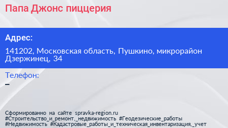 Папа Джонс, пиццерия по адресу 141202, Московская область, Пушкино, микрорайон Дзержинец, 34 в дальнейшем Организация, размещена в следующих категориях: