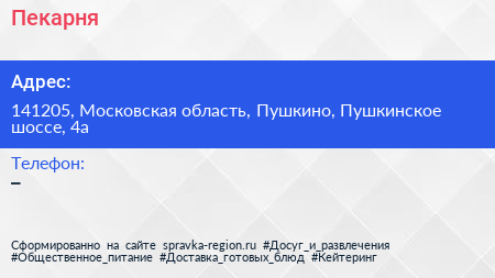 Пекарня по адресу 141205, Московская область, Пушкино, Пушкинское шоссе, 4а в дальнейшем Организация, размещена в следующих категориях: