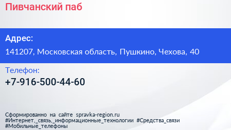 Пивчанский, паб по адресу 141207, Московская область, Пушкино, Чехова, 40 в дальнейшем Организация, размещена в следующих категориях: