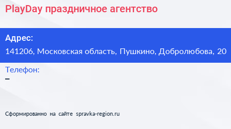 PlayDay, праздничное агентство по адресу 141206, Московская область, Пушкино, Добролюбова, 20 в дальнейшем Организация, размещена в следующих категориях: