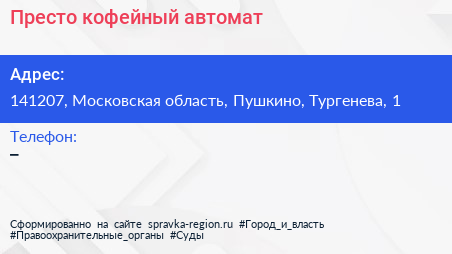 Престо, кофейный автомат по адресу 141207, Московская область, Пушкино, Тургенева, 1 в дальнейшем Организация, размещена в следующих категориях: