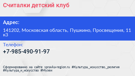 Считалки, детский клуб по адресу 141202, Московская область, Пушкино, Просвещения, 11 к3 в дальнейшем Организация, размещена в следующих категориях: