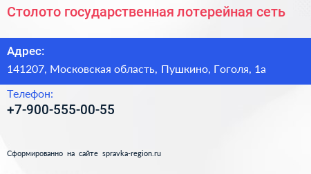 Столото, государственная лотерейная сеть по адресу 141207, Московская область, Пушкино, Гоголя, 1а в дальнейшем Организация, размещена в следующих категориях: