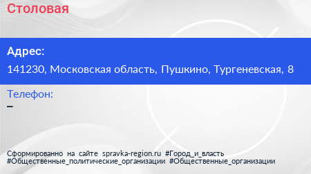 Столовая по адресу 141230, Московская область, Пушкино, Тургеневская, 8 в дальнейшем Организация, размещена в следующих категориях: