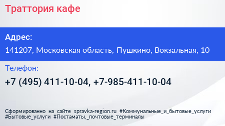 Траттория, кафе по адресу 141207, Московская область, Пушкино, Вокзальная, 10 в дальнейшем Организация, размещена в следующих категориях: