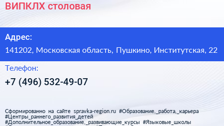 ВИПКЛХ, столовая по адресу 141202, Московская область, Пушкино, Институтская, 22 в дальнейшем Организация, размещена в следующих категориях: