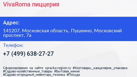 VivaRoma, пиццерия по адресу 141207, Московская область, Пушкино, Московский проспект, 7а в дальнейшем Организация, размещена в следующих категориях: