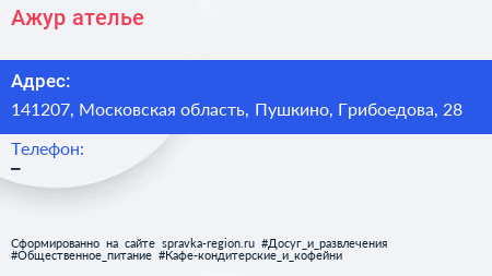 Ажур, ателье по адресу 141207, Московская область, Пушкино, Грибоедова, 28 в дальнейшем Организация, размещена в следующих категориях: